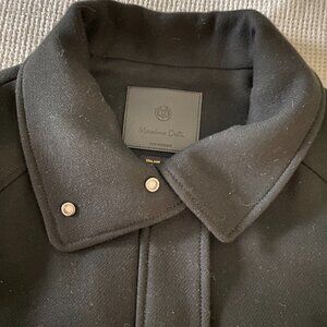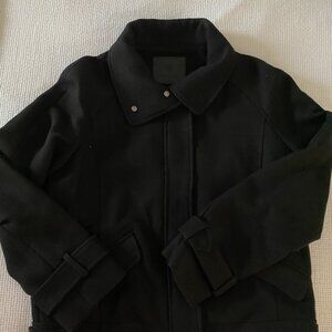 This wool jacket is styled like a motorcycle jacket. It is a deep black color (one pic is not a true color). Has many finished details; small metal, flat brads on the collar and tabs at the hem. Very comfortable and a great jacket to wear with jeans, over sweaters.