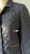 Classic navy quilted jacket with button & zip closure. Features stylish faux leather brown accents. Ideal for versatile wear.