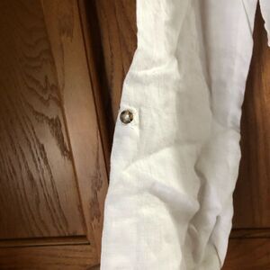 Features: Collared neck, button front closure, soft lightweight solid white linen fabric, 1 breast pocket, beautiful ruffle & hidden front accents, roll tab sleeves