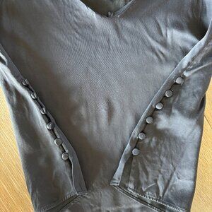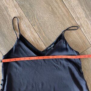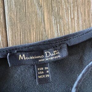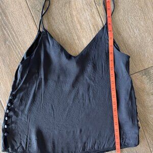 This is a Massimo Dutti black strappy tank top in size 4. It features a V-neckline, sleeveless design with spaghetti straps, and button sides detail. Made of satin acetate material, this tank is suitable for various occasions like travel, parties, casual wear, or business settings. The tank has a regular fit and is machine washable.