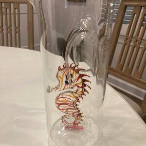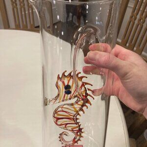 This extraordinary hand-blown glass seahorse water pitcher is a special way to welcome guests to your table. The seahorse within the transparent/clear pitcher has red/orange, markings on its body, red spinal ridge and black eyes.
