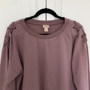 In like-new condition. So cute and comfortable. Raw hem, but sewn so it doesn't Frey. Weave x's at the shoulders. Slightly oversized.