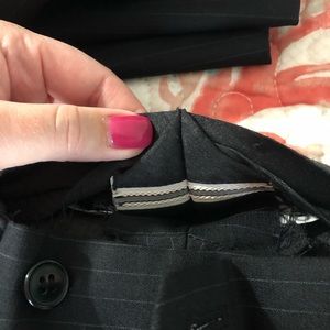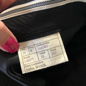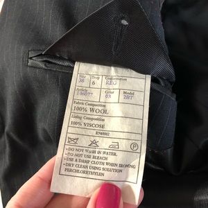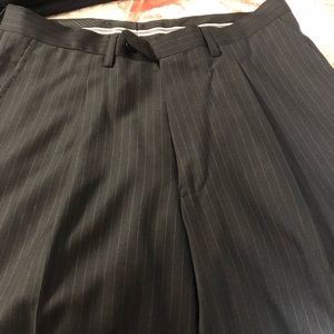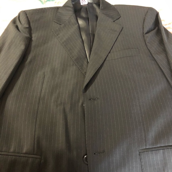 EUC. Jacket is 38R and pants are 36S which were altered to be a 31 waist. Black with white pinstripes