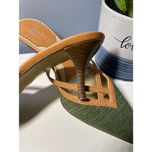 These are beautiful leather miles made in Italy with leather upper and leather soles. They are a very pretty green and tan color with pointed toes. Heels are in excellent condition. I love the cross cross leather straps on the front. Please see the last photo to show some cracking INSIDE the shoe and not visible.