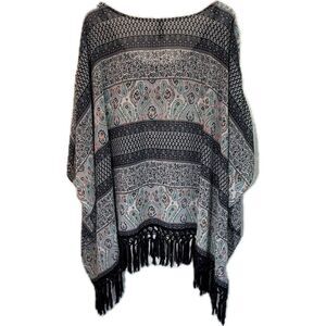 This Massini poncho sweater showcases a chic black and gray color palette with a flowing silhouette and wide, draped sleeves. The design is enhanced by a stylish fringe hem, adding texture and movement to the piece. Perfect for a casual, bohemian look, this sweater is a versatile addition to any wardrobe.