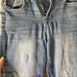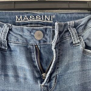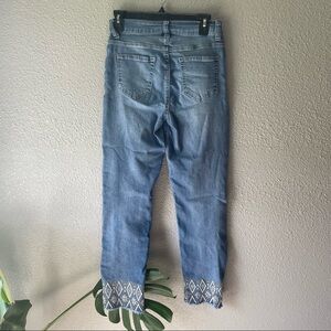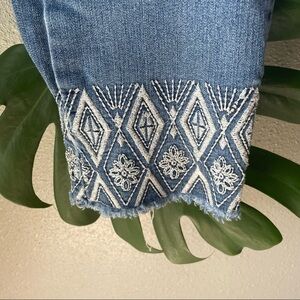 Massini Embroidered Hem Jeans. Light wash jeans with white embroidered print at the hem. Raw edge hem at the leg. Super soft denim with a bit of a stretch. Zip and button closure. mid-rise.