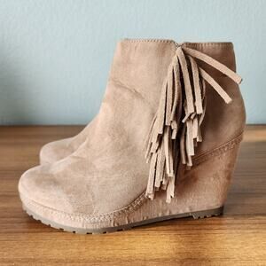 NWOT: Stylish, tan faux suede ankle booties with fringe accent / inside zip closure / hidden wedge heel / almond toe / non slip sole by Massini. In excellent intact condition with working zippers. **Disclosure: there is no size marking.