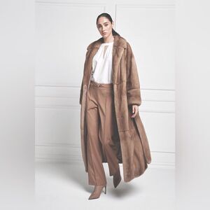 Long vertical mink coat in light pastel brown, with notched collar, mink belt closure, flap pockets, fully lined.