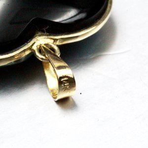 Elevate your style with this exquisite 14K gold necklace, showcasing a heart-shaped pendant adorned with a mesmerizing mosaic of opal and black onyx on the reverse side. The necklace and pendant are both marked with the esteemed 14K gold stamp, guaranteeing their authenticity and superior quality. Immaculately preserved, this necklace is in pristine condition, radiating an undeniably captivating allure. The 20-inch chain gracefully drapes around your neckline, while the pendant, measuring 20mm by 21mm, serves as a stunning focal point, delicately enhancing your ensemble. Weighing a total of 5.50 grams, this necklace offers both elegance and comfort, making it the perfect accessory for any occasion.
