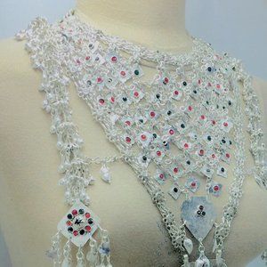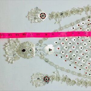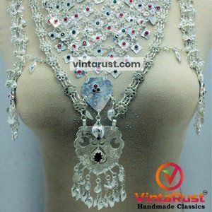 This silver-hued tribal statement massive Afghani necklace was handcrafted in 1990s. This multilayer massive tribal necklace has silver dangling pendant with multihued glass stones engraved in it. The chains used in this necklace are depicting a vintage feel. These metallic chains with metal leaves are enhancing the look of this necklace.