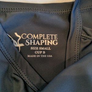Mastectomy Tankini Swim Top with Integrated Prosthetics, Small with B Cup, New With Tags, Color Black, by Complete Shaping mastectomy clothing. Breast prosthetics are built into the top so no need to purchase additional breast forms. No bra band or elastic across chest on scars. For breast cancer survivors who have undergone a double mastectomy with flat closure. Made in the USA.