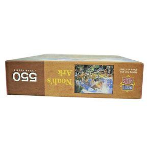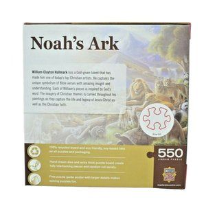 The MasterPieces Noah's Ark Jigsaw Puzzle is a 550-piece set featuring large, multi-colored pieces made of high-quality cardboard. It's a complete set, perfect for puzzle enthusiasts and collectors.