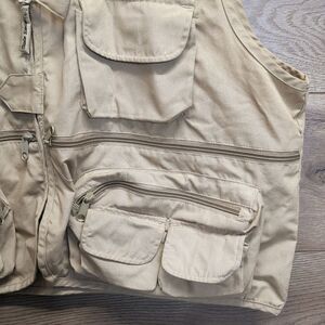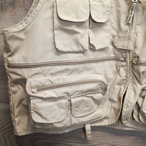 Versatile tan fishing vest with multiple pockets. Ideal for outdoor activities.