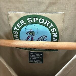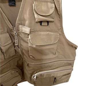 Master Sportsman Rugged Outdoor Gear SZ L Fishing Vest Khaki Multiple Pockets. This fishing vest is in excellent condition. it has 9 velcro pockets And one fishing pole Velcro holder. It has 5 zippered pockets that are ample size for all kinds of fishing gear. It has one zipper up the front. Great for a fisherman.