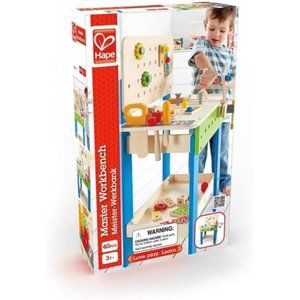 Hape's 35 Piece Master Workbench is a kids toolset a little builder will love you forever for, it allows your kids to build structures separately or attach pieces right on it.It is the ultimate kid's toolbox emulating a professionals work station and tools. The workbench allows your child to practice the name of the tools, describe the use of each one, and describe what he or she wants to build with it.Design and MaterialsHape has designed realistic tools for children's hands enabling your little handyman and girl to build and fix anything they want.35 piece kids tool set including a hammer, saw, screwdriver, wrench, vice, angle, screws, nuts, bolts, gears, links and more creative parts for building.All tools made from wood sourced from environmentally sustainable forests.