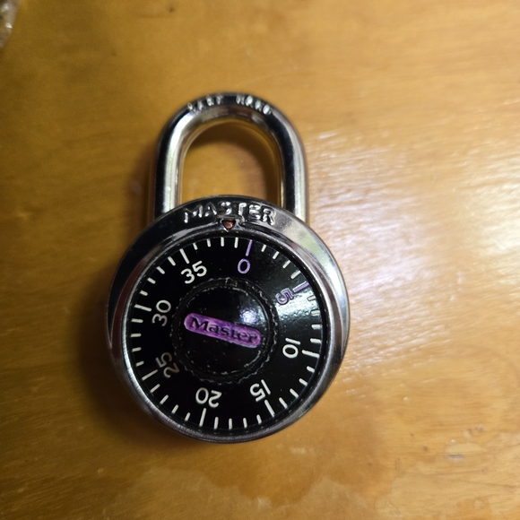 Master combination lock. Colored in a couple numbers purple as well as the word master. Those numbers are not part of the combination. Combination will be sent with the lock. I do not know how to change the combination. Was used on my Locker in HS.