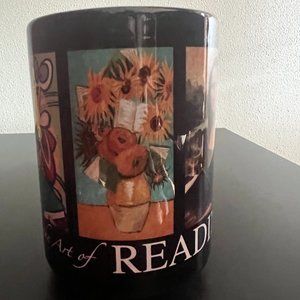This sensational ceramic mug features four iconic Art Masterpieces that have been altered by the addition of books to the paintings: Leonardo da Vinci’s Mona Lisa, Grant Wood’s American Gothic, Vincent Van Gogh’s SunFlowers, and Pablo Picasso’s Nude and Still Life. It reads: Master the Art of Reading in bold white letters on an onyx black background. Large stylish and comfortable handle. Measures 4.5" tall with a 3" diameter. Holds fluid 12 oz.