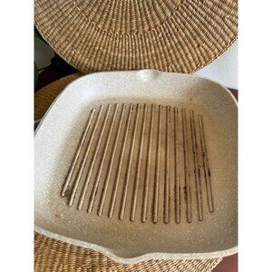Sturdy speckled ceramic nonstick grill pan with faux wood handle. Measures 11” x 11” across the cooking surface, with a 7” handle. Compatible with ceramic, gas, halogen, electric, and induction stovetops. Shows signs of use and discoloration on the bottom.