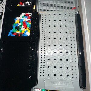 Includes colorful pegs, black/white key pegs & built-in storage tray
