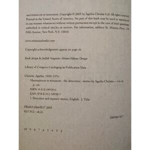 Trade paperback copy of Masterpieces in Miniature: The Detectives’ Stories by Agatha Christie, featuring Parker Pyne, Harley Quin, Hercule Poirot, and Miss Marple. Copyright page lists copyright 2005 by Agatha Christie Ltd., with the first St. Martin’s Griffin edition also dated 2005 and printed in the United States of America. The publisher is St. Martin’s Griffin, an imprint of St. Martin’s Press, with address 175 Fifth Avenue, New York, NY 10010. The ISBN is 0-312-34938-6, and the EAN/13-digit ISBN is 978-0-312-34938-7, both shown on the copyright page and back cover. The book shows general shelf and corner wear with minor creasing and edge rubbing, light page toning, and a solid, unbroken spine; interior pages are clean and free of writing or remainder marks.