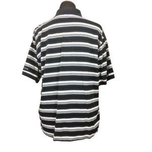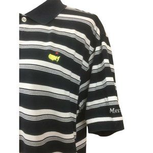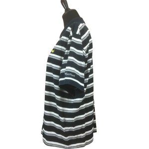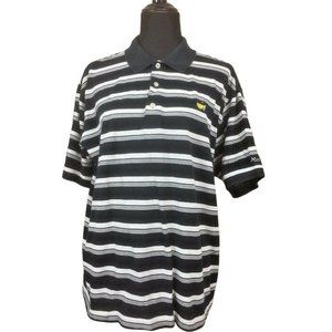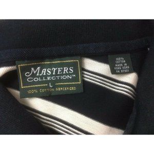 Masters Collection navy blue and white striped polo shirt. Has embroidered logo on chest and sleeve. Nice condition. Mens size L.
