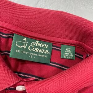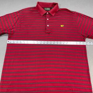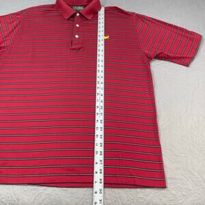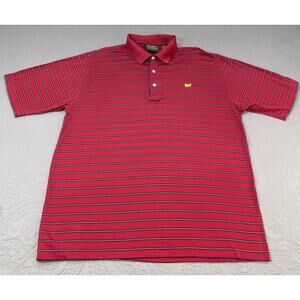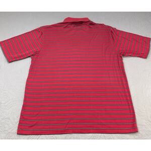 Stylish red polo with black stripes. Features a classic collar and button placket. Iconic logo on chest.