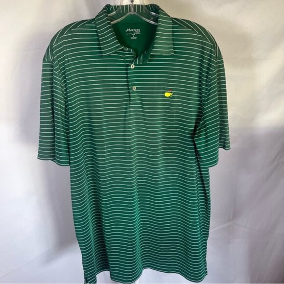 Masters Tech Striped Men's Polo Shirt Green with White stripes. Size Large. Elevate your style with the Masters Green Striped Men's Polo Shirt. Perfect for casual outings or a day on the golf course. Lightweight. 92% Polyester 8% Spandex. In excellent used condition.