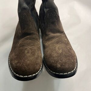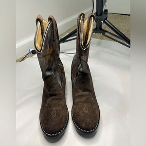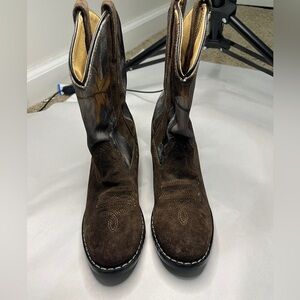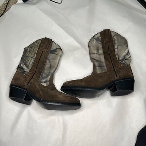 Nice combination camo and brown suede cowboy boots for your little rancher. Suede does show some wear in the form of light discoloration and nubbiness. No other noted flaws. Lots of life left in these quality boots.