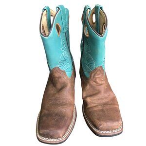 Authentic western style for kids! These Masterson Boot Co. cowboy boots feature a rugged distressed brown leather foot paired with a turquoise leather shaft detailed with classic western embroidery. Built for durability and comfort, they include pull holes for easy wear, a square toe, and a stitched welt design. Perfect for everyday wear, school events, or western outings.