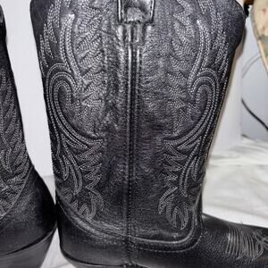 The Masterson Boot in women's size 7 wide is a stylish cowboy western boot in black leather. Suitable for travel and casual occasions, these boots feature a regular calf width and a classic western style with a cowboy theme. Perfect for all seasons, these boots are durable and versatile, making them a great addition to any wardrobe for those looking for a touch of the wild west.