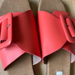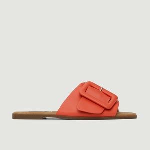 “Women’s flat modern sandal with matching buckle detail. Made with recycled materials.