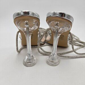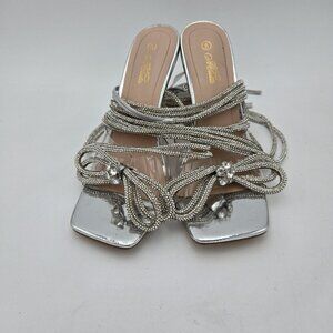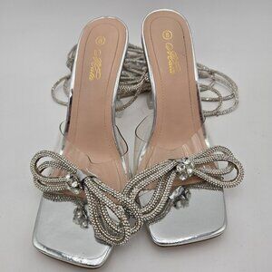 Mata Silver Lace Up Bow Square Toe Heels Womens 8 Martini Heel Clear Sparkle EUC