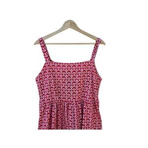 Cute red and white print with sweetheart neckline. Button up. Pockets. Mini dress.