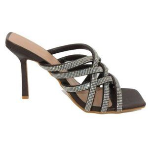 These High Heel Slip-On Sandals Have A Rhinestone Woven Style Heel.