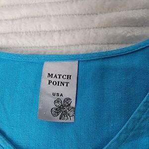 Beautiful and comfortable Match Point USA tunic top in vibrant turquoise blue. Made of 100% pre-shrunk linen (style LT19V, cut 5094). Features a V-neckline, 3/4 length sleeves, relaxed fit, and side slits for ease of movement. Lightweight and breathable—perfect for spring and summer wear.