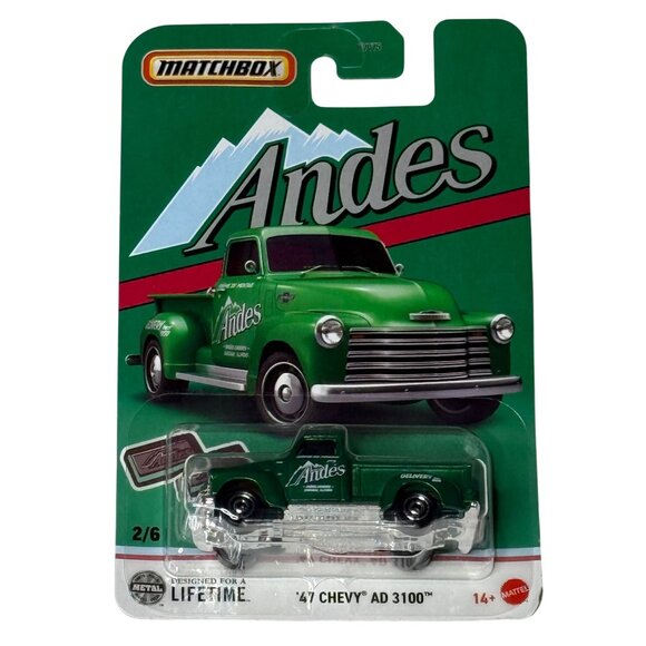 This Matchbox ’47 Chevy AD 3100 Andes Mints Delivery Truck features a classic vintage pickup casting with a bold green Andes chocolate design. Part of the Candy Series (2/6), this collectible is perfect for Matchbox fans, candy-brand collectors, and holiday gift buyers.