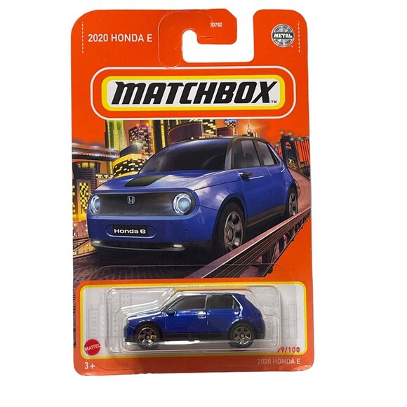 Matchbox 2020 Honda E in blue from the 2022 mainline (79/100). Compact electric vehicle with diecast metal body. Base code: HFP11-4B10. New on card — slight bend in card edge (see photo). Great for EV collectors, urban car sets, or Matchbox fans.