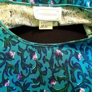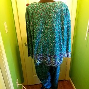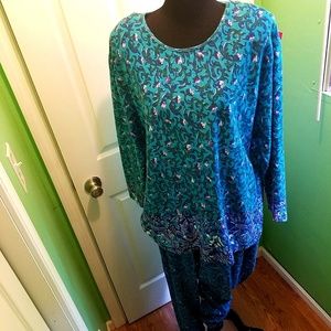 Great petite purple/lavender vine floral print. Turquoise color. Pants do match perfect, pics bad. Open round neck, floral design at hem, longsleeve. Pants are elastic.