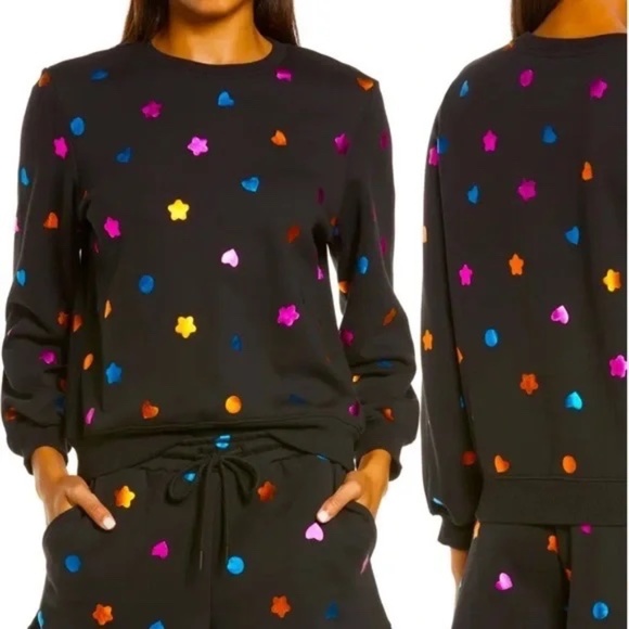 Super cute sweatshirt and shorts set but worn look from the dryer. Love it but it does collect fuzzies (need lint roller). Metallic shapes are slightly faded from being in the dryer (tags say do not tumble dry... oops). Super cute but being pregnant, this no longer fits me! Shorts have pockets!