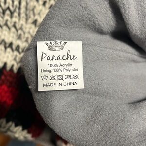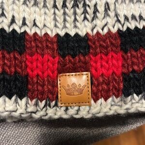 Colors: Black, White, Gray, Red & Brown faux fur on top of hat. There is a black and red plaid pattern on top of a gray/white background.