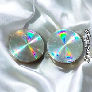 This pair of matching holographic pins features a striking, reflective design that shifts in color depending on the angle and lighting. Measuring approximately 1 inch across, these pins offer a compact yet bold visual effect, making them a standout accessory for bags, jackets, hats, or pin collections. Their unmarked design provides a sleek and versatile look, allowing them to complement a variety of styles.