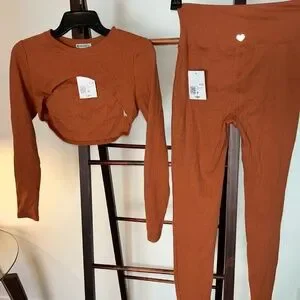 Orange long sleeve high-low cropped top with matching leggings.