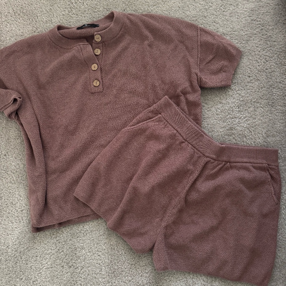 Matching set with shorts and t-shirt, thicker material but still breathable, lightly worn, shorts hit about 3-4 inches. SOLD AS SET