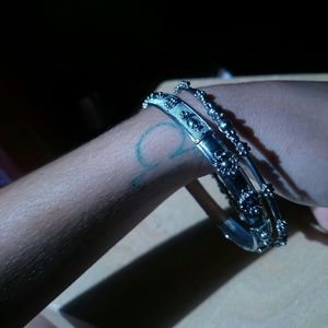 Two coordinating bangles made of metal, decorated with small metal flowers, metal mesh, and other metal trinket designs. One thick and one thin💟