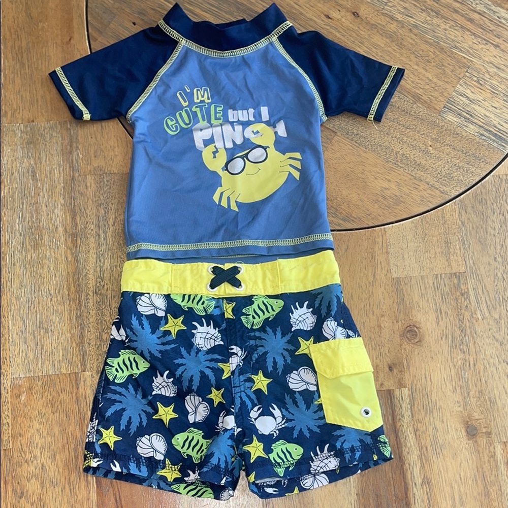 This adorable kids swim set features a playful crab design. The vibrant blue and yellow colors make it perfect for fun in the sun. Ideal for beach or pool days.