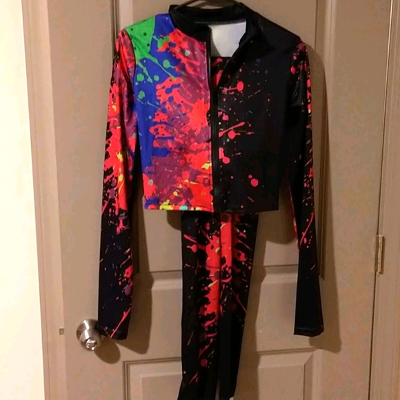 Long sleeve jacket and pants. Splat paint design black with pink blue and green. Fun and colorful form fitting