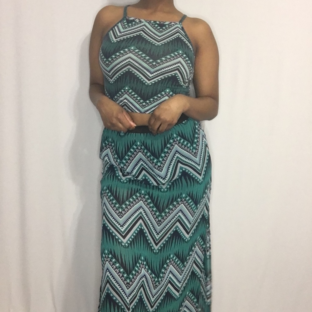 Teal matching, patterned, skirt set. The bottom has a black mini skirt on the inside and the rest is mesh materials.