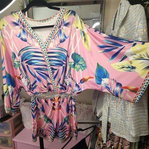 Pink tropical print shirt and shorts set w/ kimono sleeve. Stretch material.