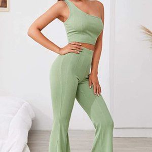 Women's 2 Piece Pants Outfits One Shoulder Crop Tank Top and Flare Pant Set