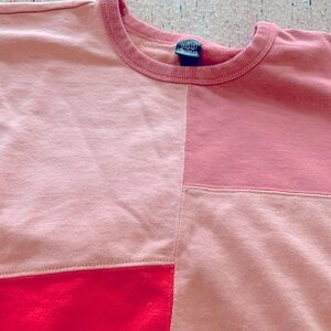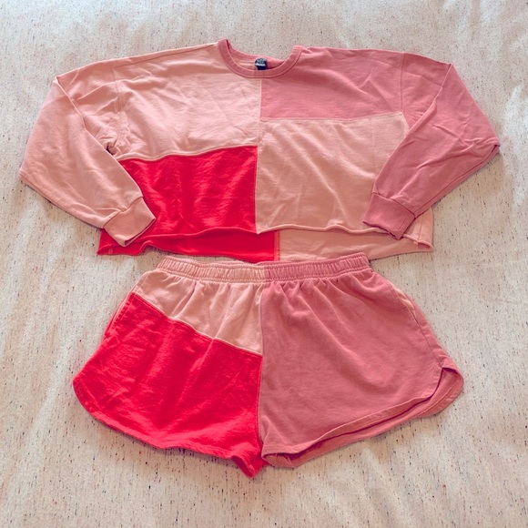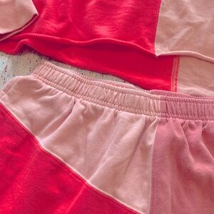 Colorblock crew sweatshirt with roll hem and matching high waist short in super comfy lightweight fleece in shades of peach and pink look feminine and chic.